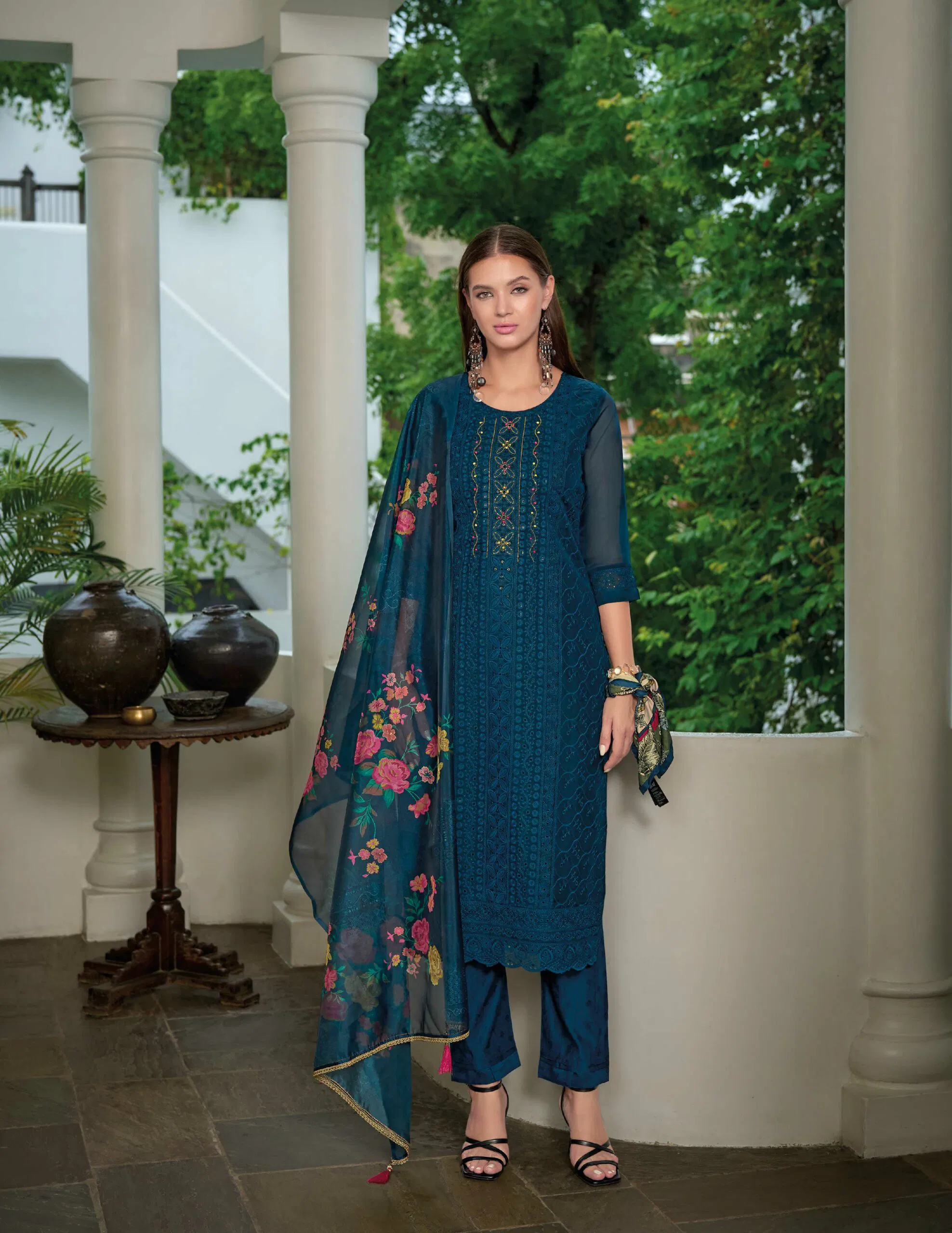 – **Artisanal Chikan Kari Embroidery:** The highlight of this ensemble is its intricate Chikankari work, meticulously hand-stitched by skilled artisans. This time-honored embroidery technique showcases delicate patterns that add a touch of elegance to your look.